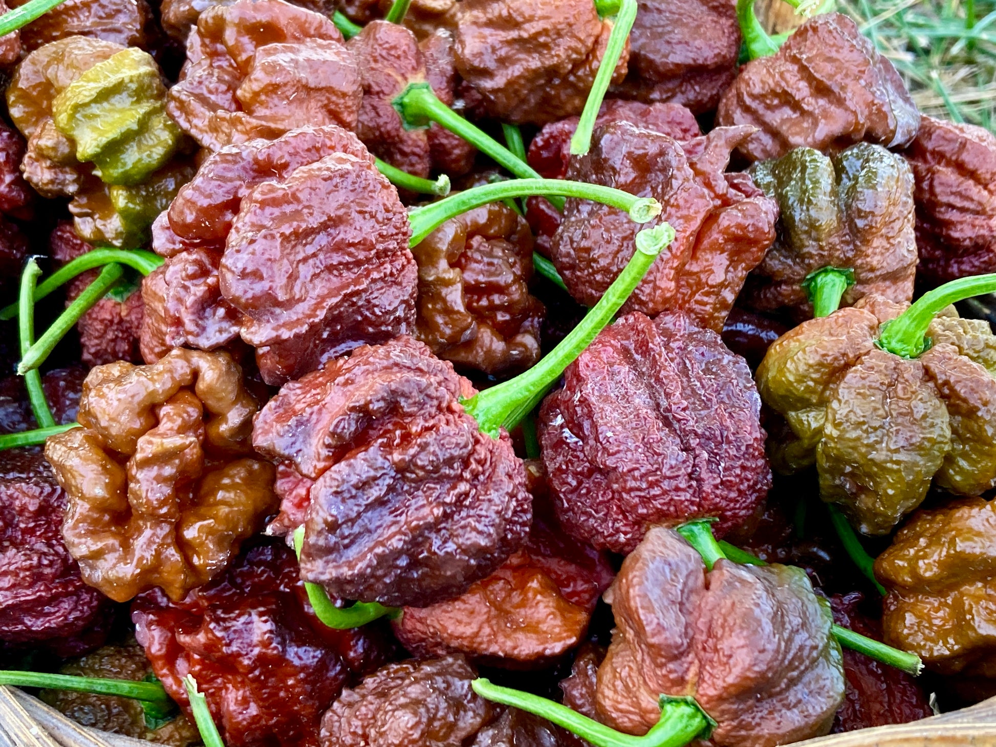 These peppers are EXTREMELY HOT. Handle with gloves and use sparingly. A tiny amount goes a very long way!
